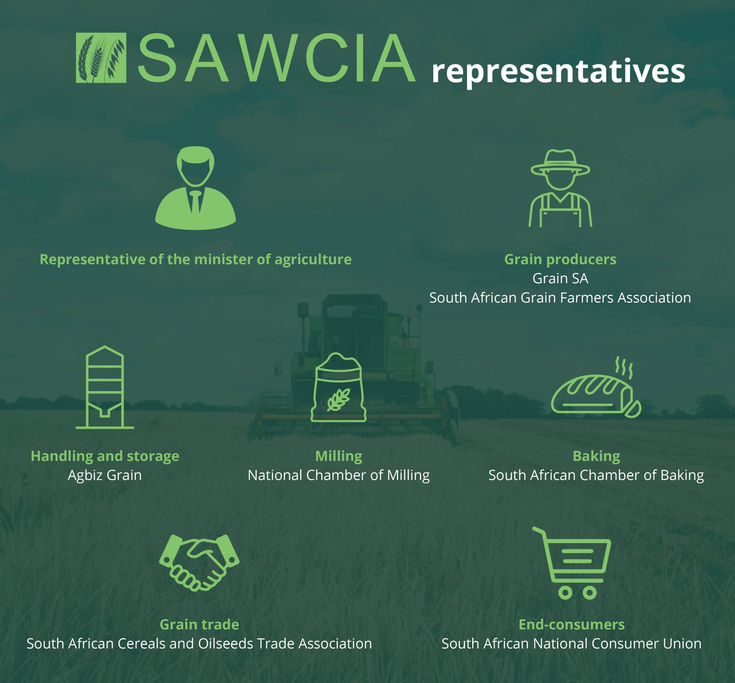 SAWCIA’s board is composed of representatives from various sectors of the grain value chain as illustrated below.